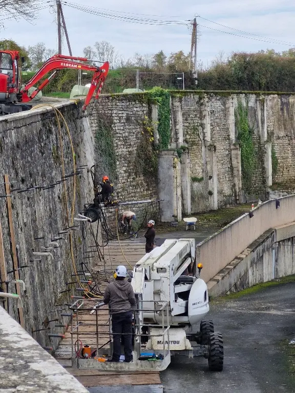 - Confortement par clouage : Installation de tirants métalliques injectés sous pression pour ancrer la structure dans la roche.